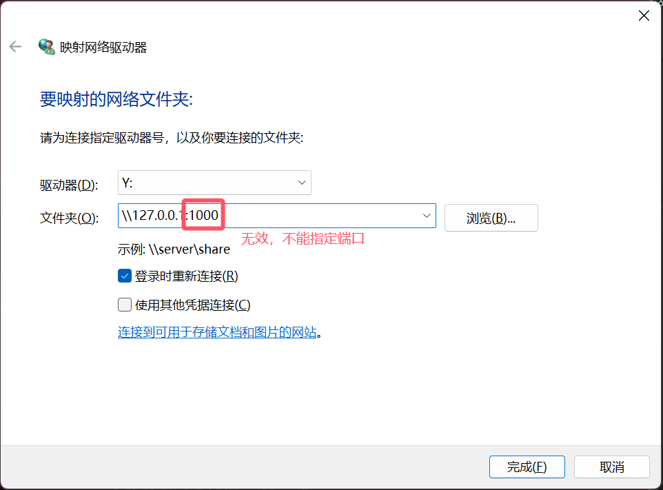 依然是使用Windows资源管理器,但是尝试让它连接到我们想要的端口。